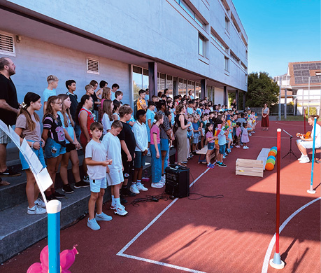 Wie jedes Jahr wurden an der Schulschlussfeier scheidende Lehrkräfte verabschiedet und neue Kolleg*innen willkommen geheissen. Der Gemeindepräsident, Patrick Marti, und der Schuldirektor,